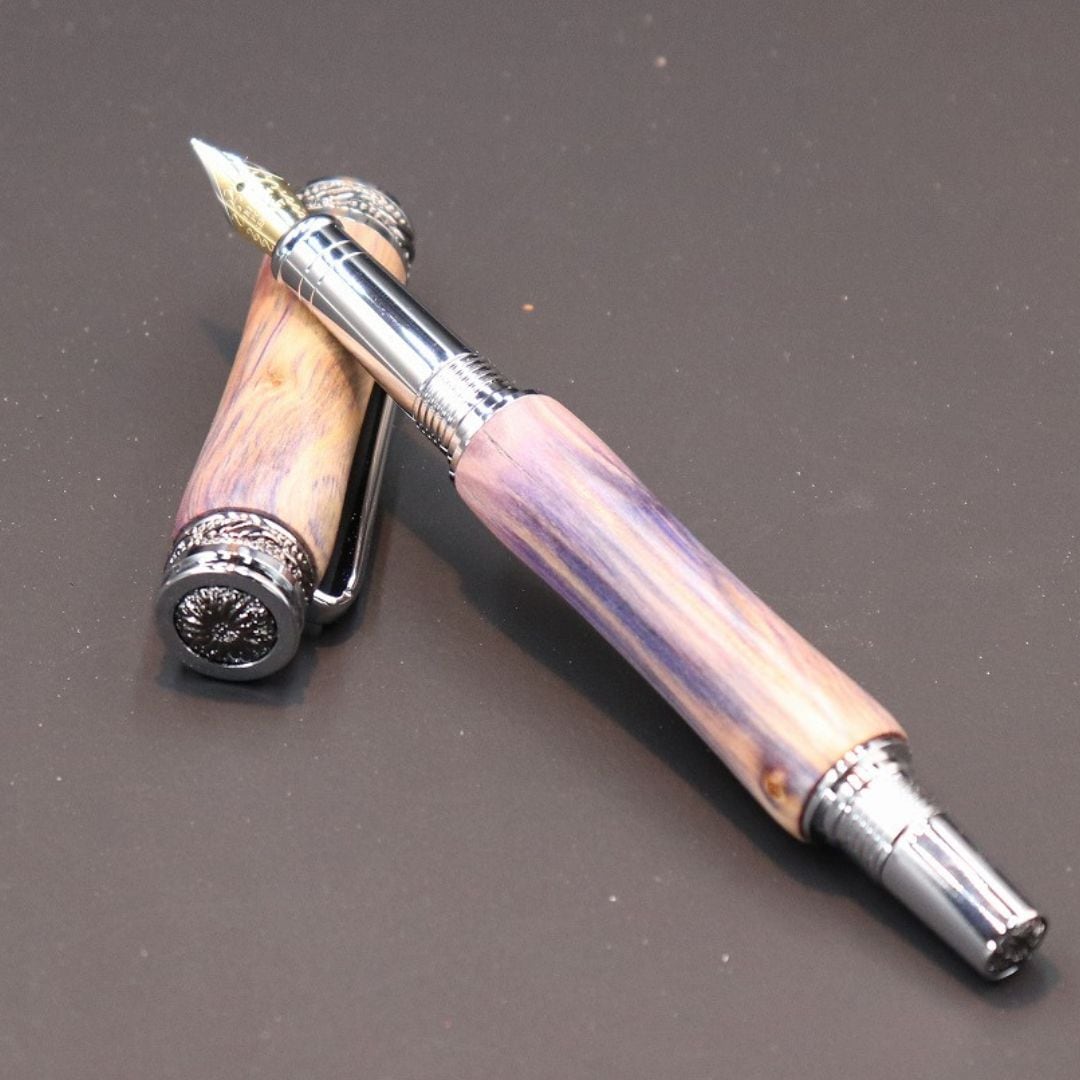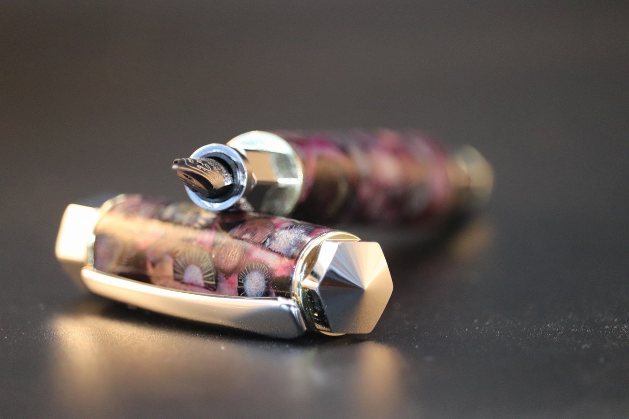 ハンドメイドによるペン。お茶の木を駆使、スタビライズドウッド、先端漆そのた素材にはこだわりを持って、独創的な高級ペン。色を浸透させてバラの枝、茎使用のペンは世界初。